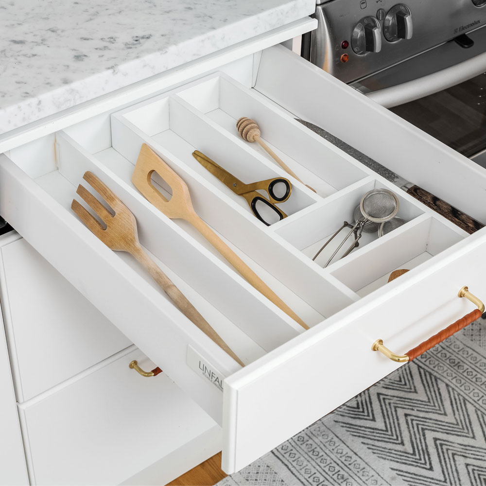 Thin & flexible drawer interior in white beech. Perfect storage for cutlery for kitchen drawers.