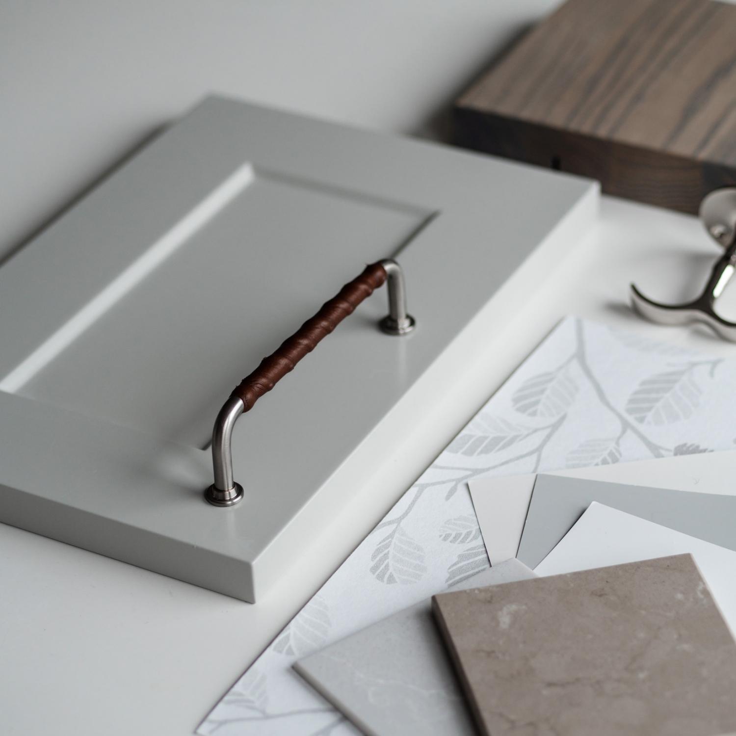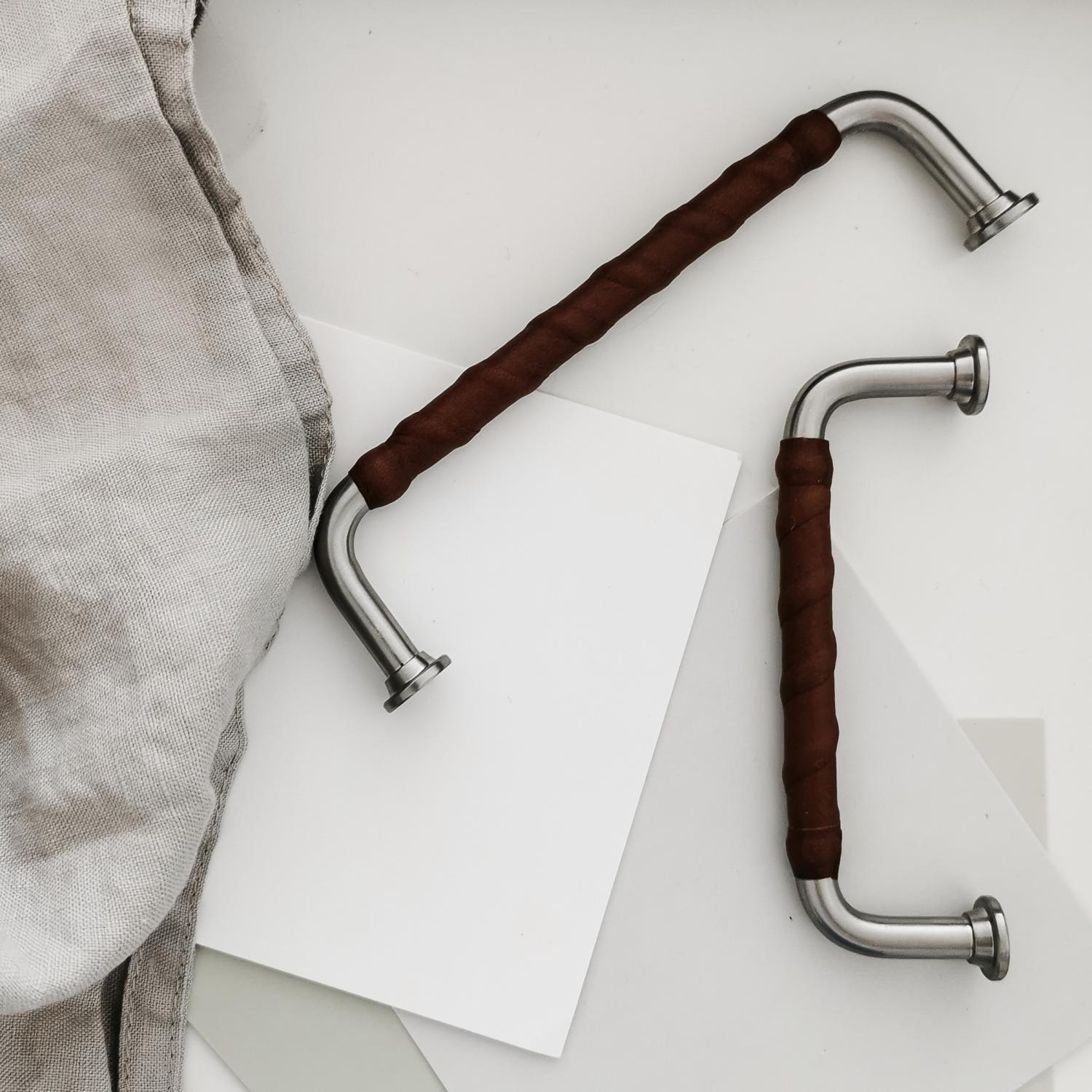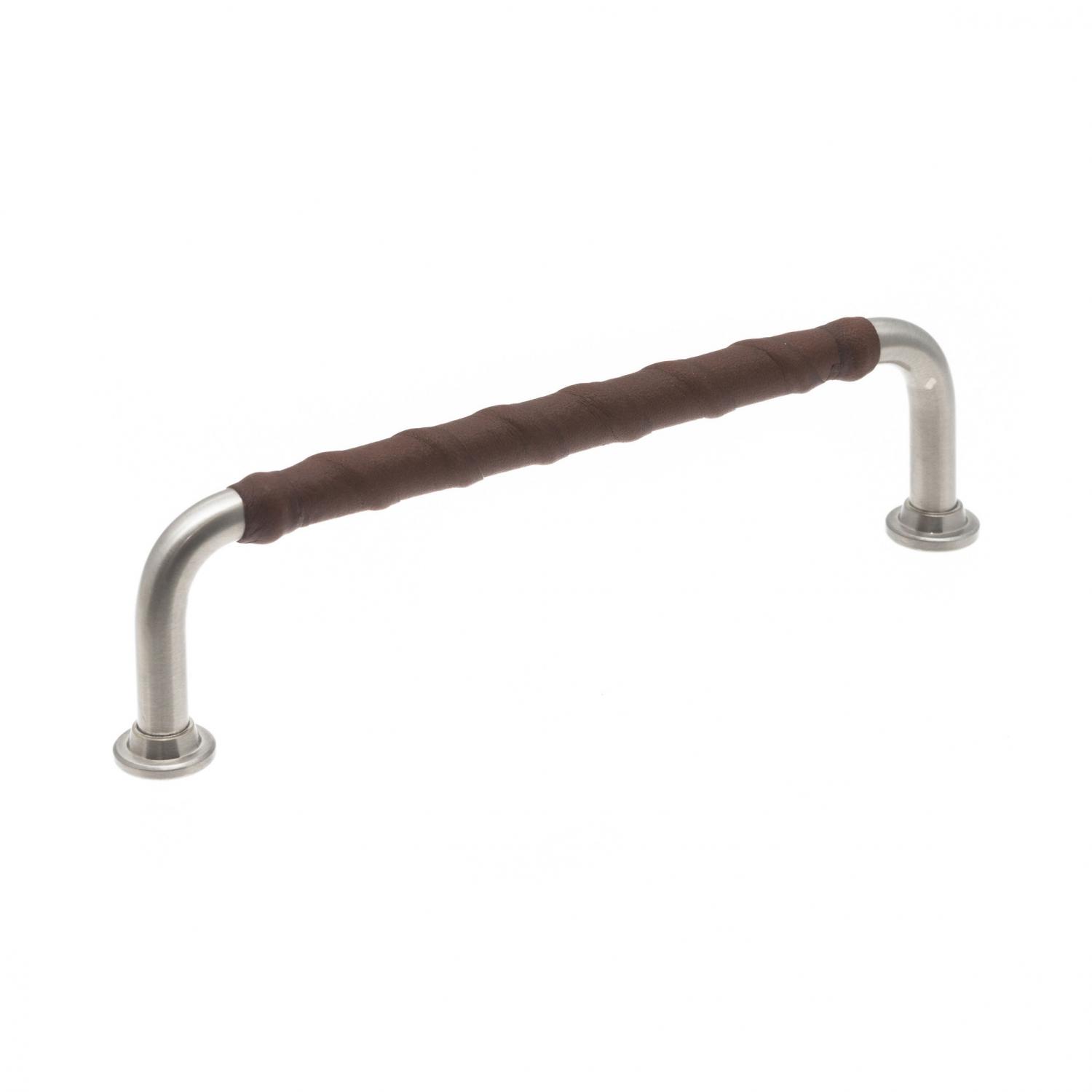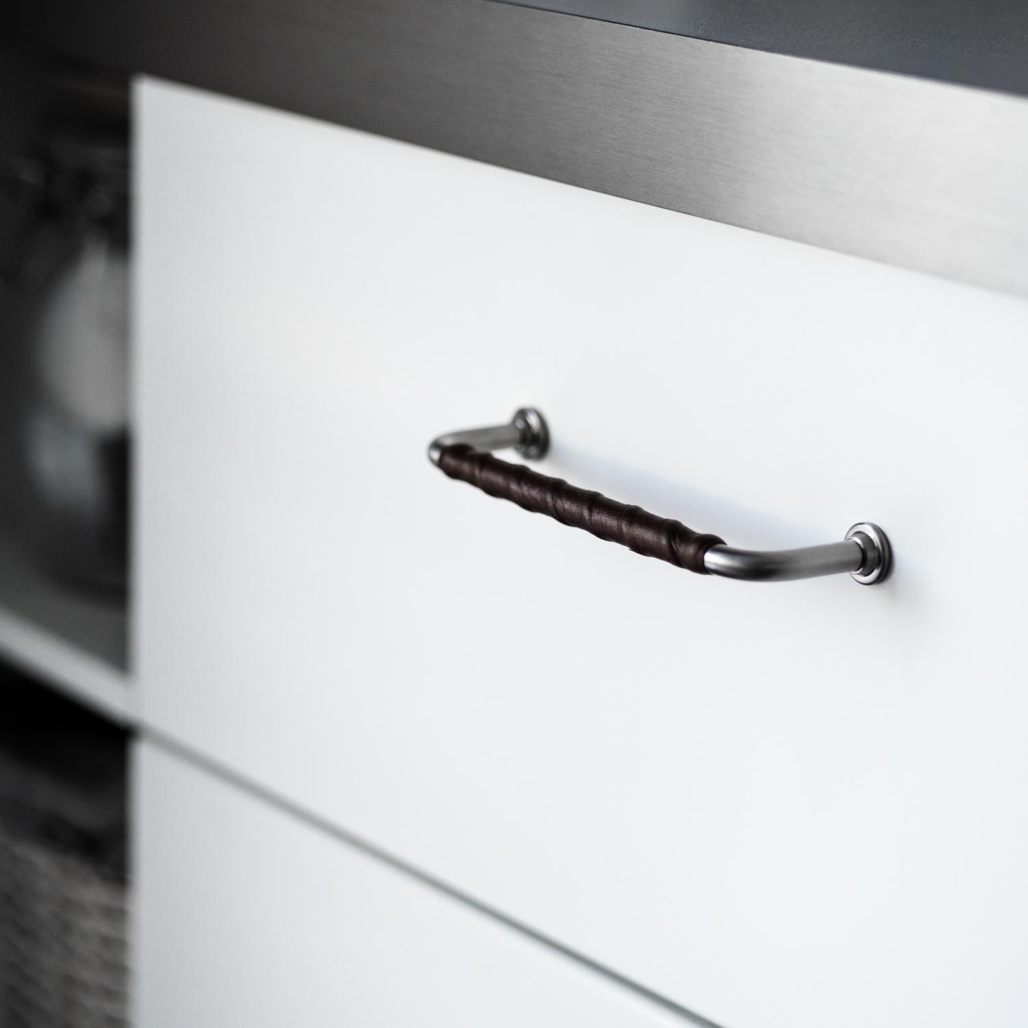 1353 is a minimalist kitchen handle in brushed nickel and here with a brown leather wrap. Choose between two different cc dimensions!