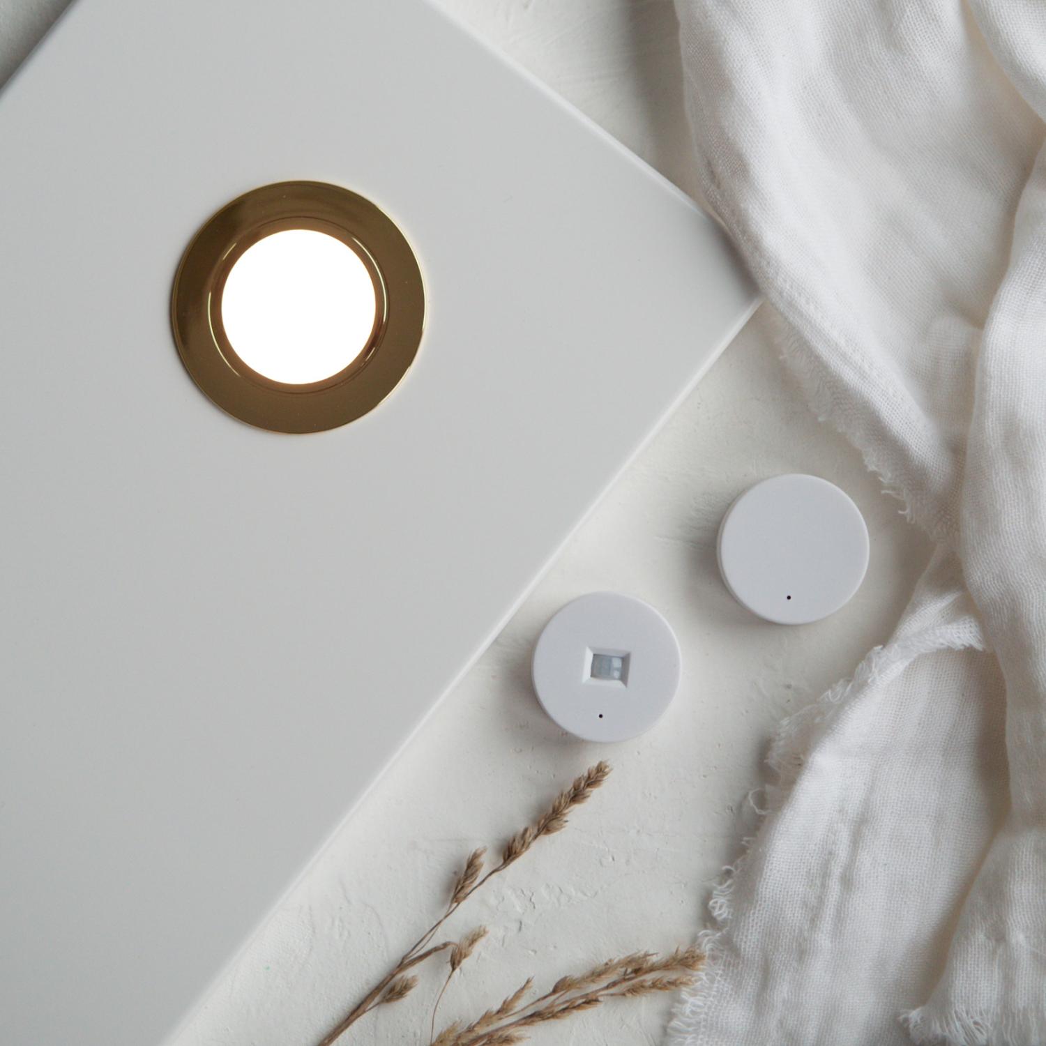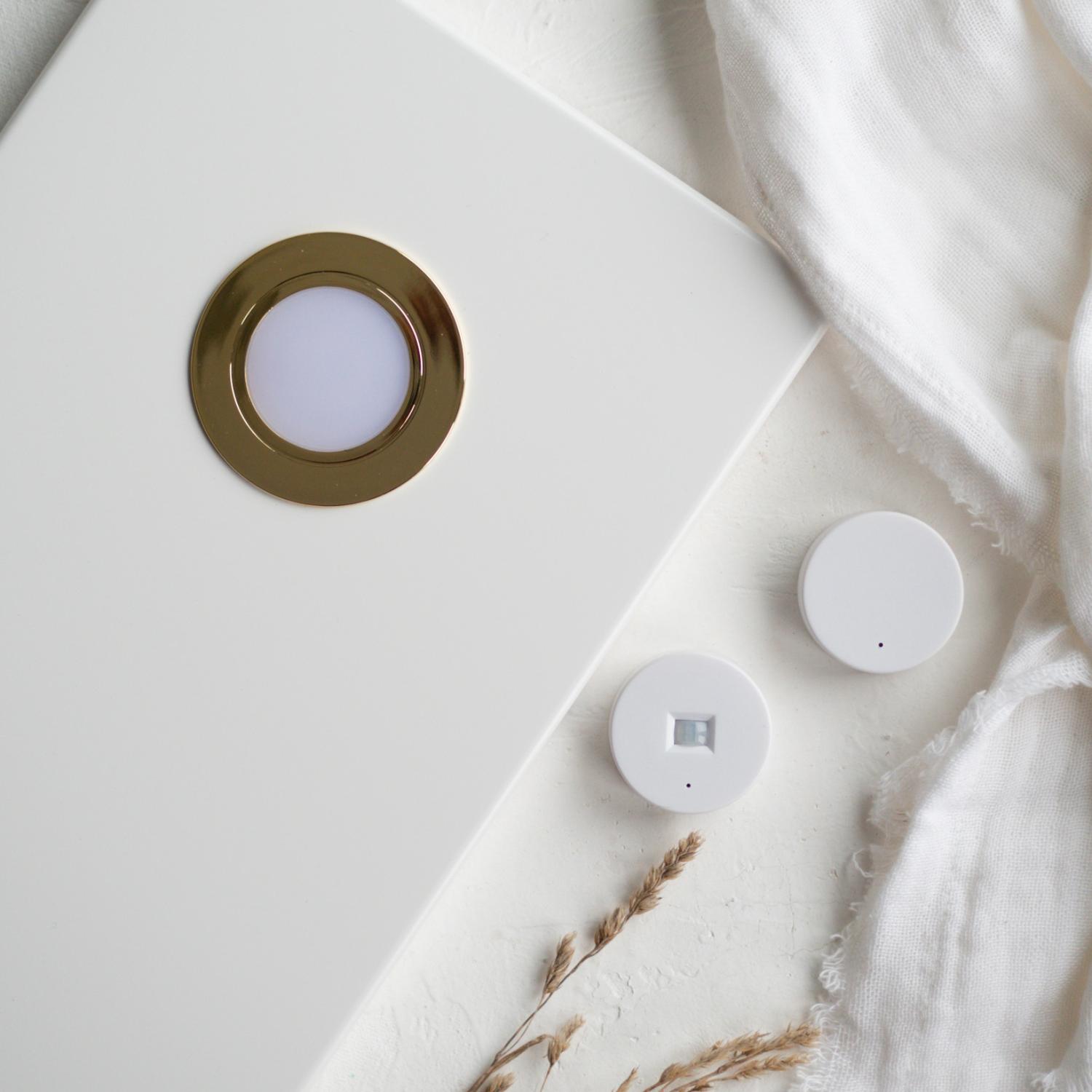 The touch sensor is a small stylish button that can be recessed or surface-mounted with a mounting ring under or inside a cabinet. With a simple touch of the sensor you can turn off or on the lights or dim the light.
