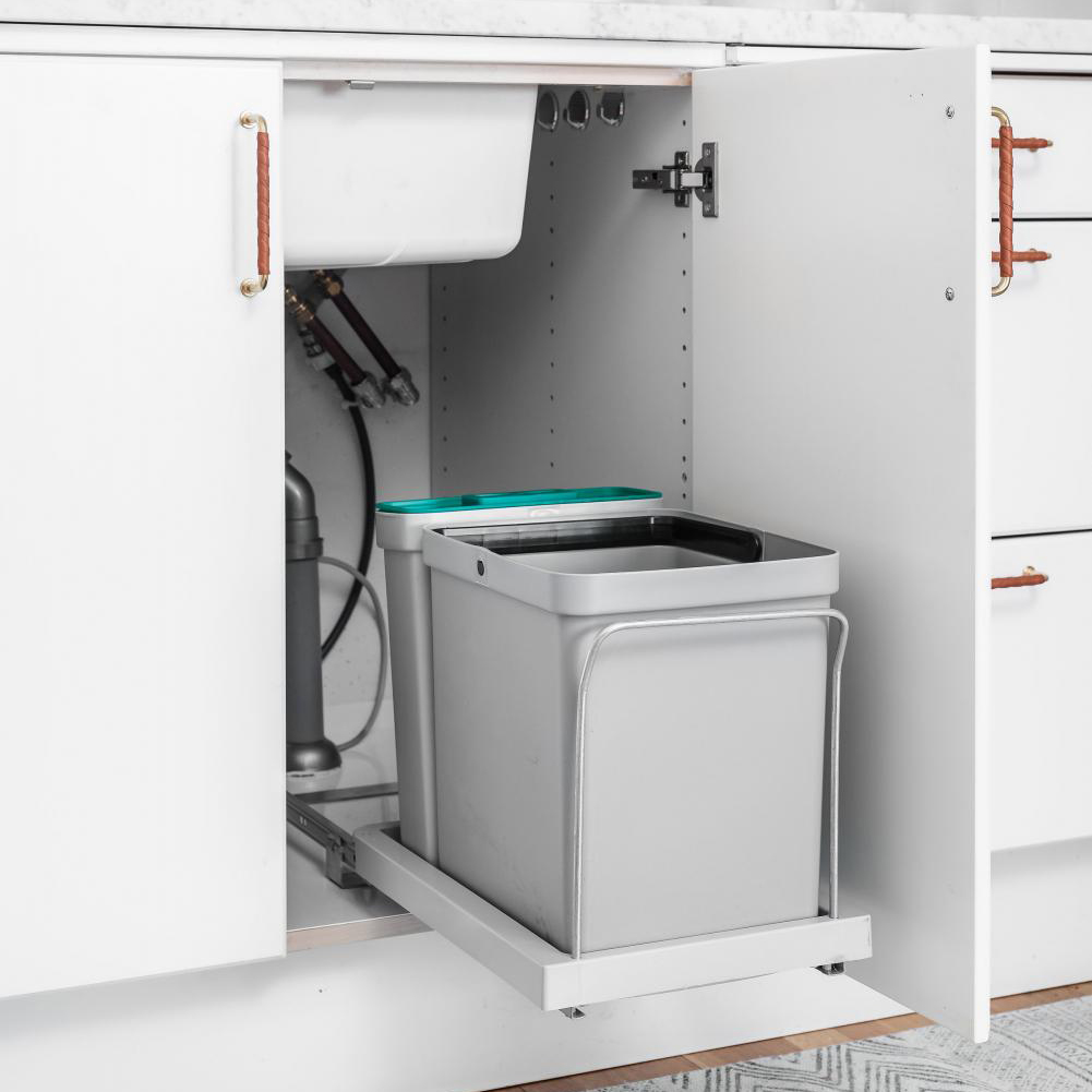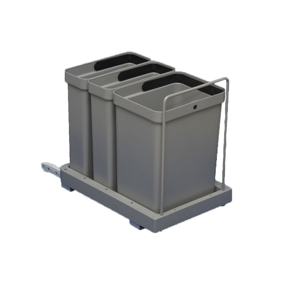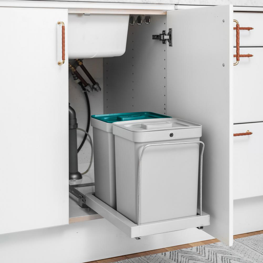 Bottenmonterad källsortering för köksskåp komplett med sophinkar och utdragsvagn.