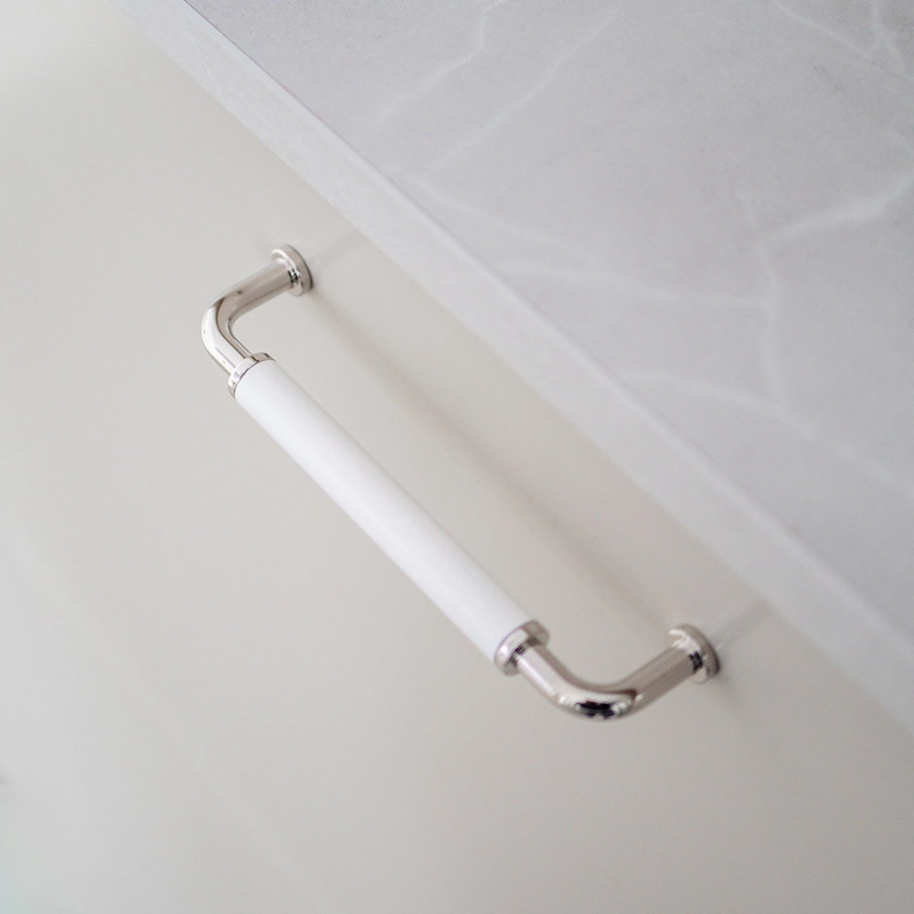 Lidhult funkishandtag i nickel och vit finns i cc 96 och cc 128 mm. Detta klassiska handtag kombinerar modern design med hållbarhet, perfekt för att uppgradera både nya och renoverade kök.
