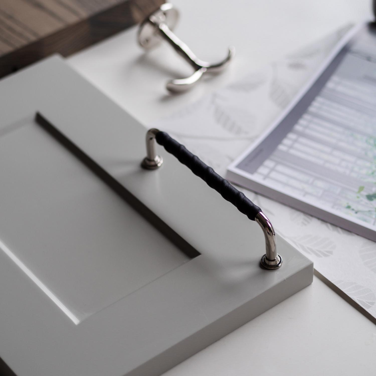 1353 är ett stilrent minimalistiskt beslag i blank nickel och här med läderlindat svart läder. Välj mellan två olika cc-mått.
